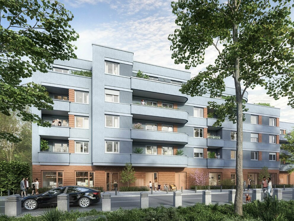 Neubau eines Mehrfamilienhauses mit fünf Treppenhäusern auf zwei durchlaufenden Parkgeschossen.
